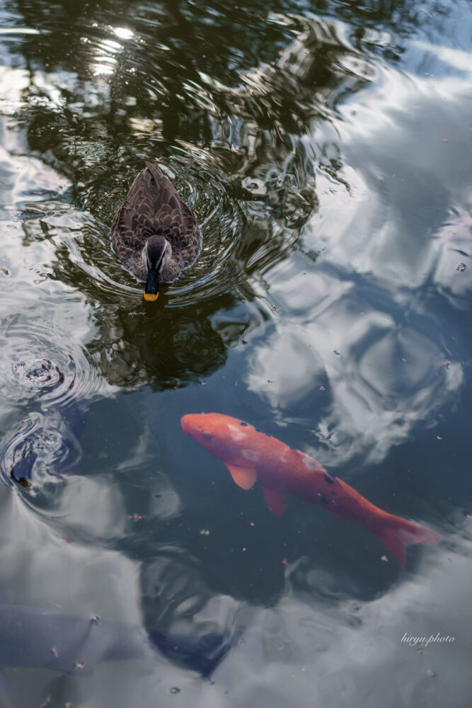 鴨と鯉 カテゴリー: 40mm, local, street photo 飛騨護国神社の堀に目を向けると鯉が泳いでいた。 カメラを向けると、鴨がフレームイン。 2026-02-26 コムラサキ 冬の予感 私の好きな場所 Portfolioの一覧へ